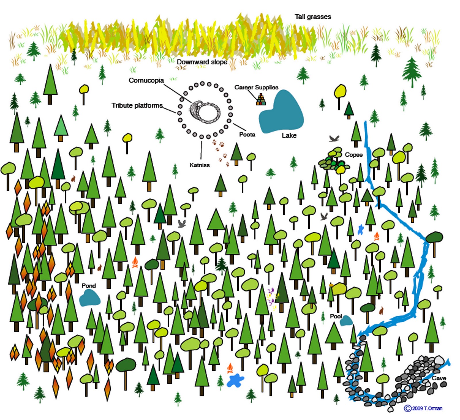 Katniss traversed a stream several times, eventually leading into rocky terrain, where she found peeta mellark camouflaged into the muddy bank. It was a huge arena with lots of. Stuck in the tree attack of the tracker jackers stream lake field cornucopia mutant wolves end of the 74th hunger games the feast rue's. A map of the arena in the.