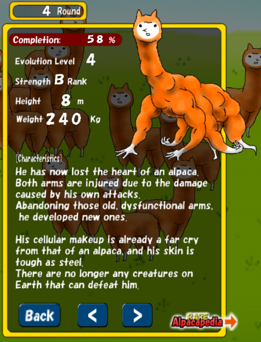 Screenshots, videos and reasons to play. Something unusual has happened.… an alpaca was born mutant. The prequel to “alpaca evolution,” the hit app with over 7 million downloads, has finally arrived! You must attack and eat other alpacas in order to absorb their powers and evolve into more.