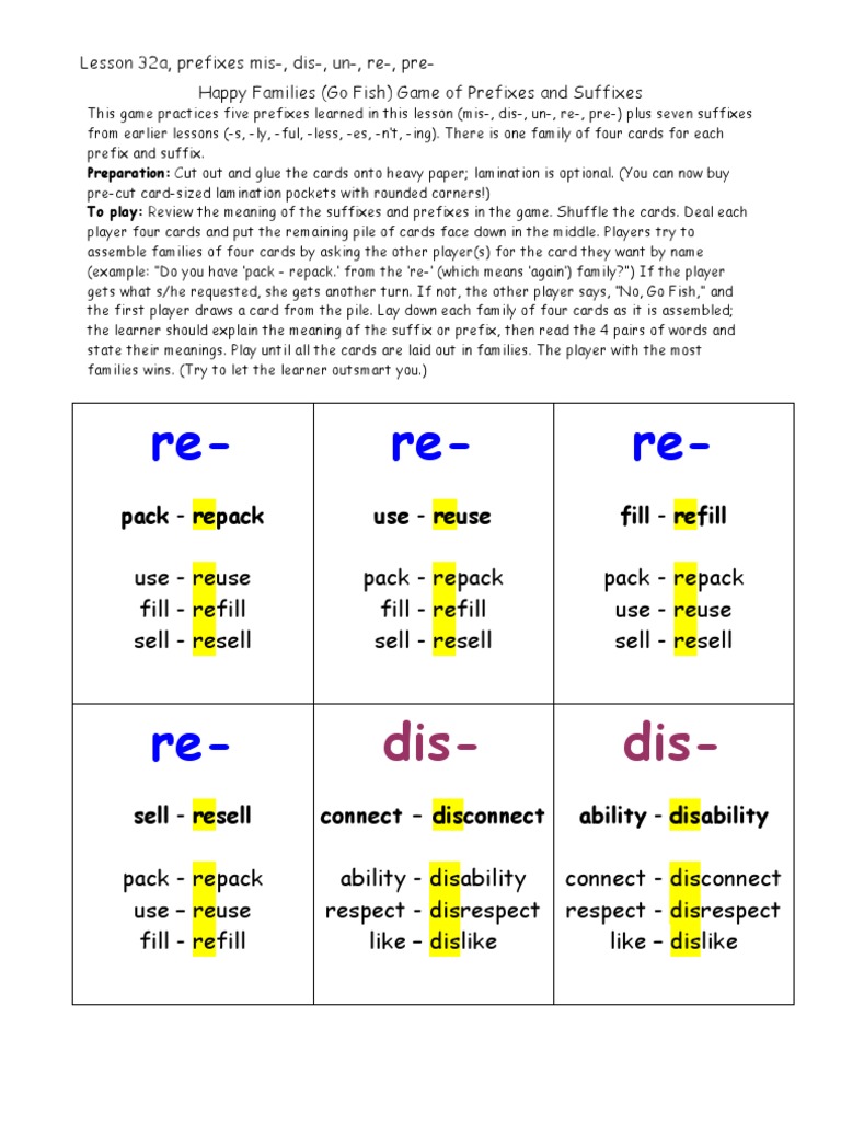 Lesson 32a, Prefix and Suffix Game, Happy Families Card Games Leisure