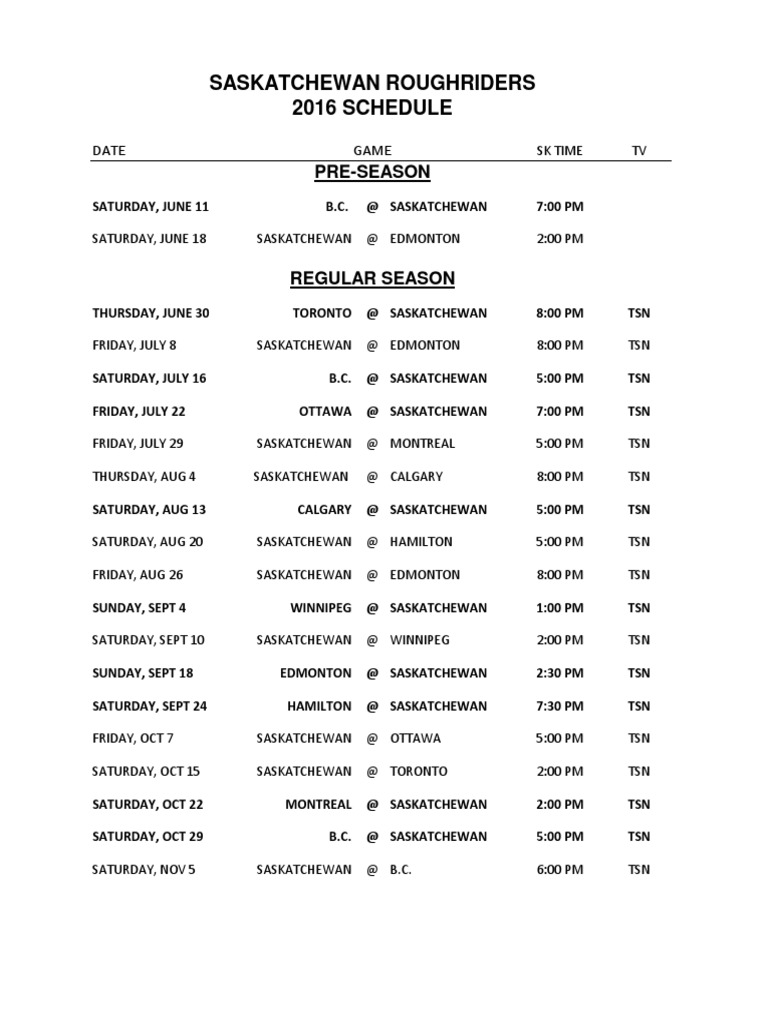Saskatchewan Roughriders Schedule
