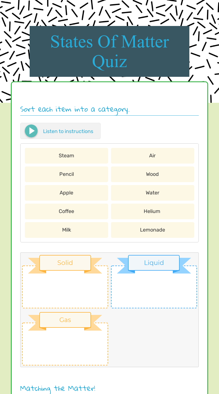 Web this excellent states of matter science simulator is a fun and effective way for you to introduce your class to the different states of matter. Suitable for kids in grades 1 to 6, this game will help you master the basics of matter science. Web state of matter games. Students will then be assessed through a sorting activity where they will classify different objects.