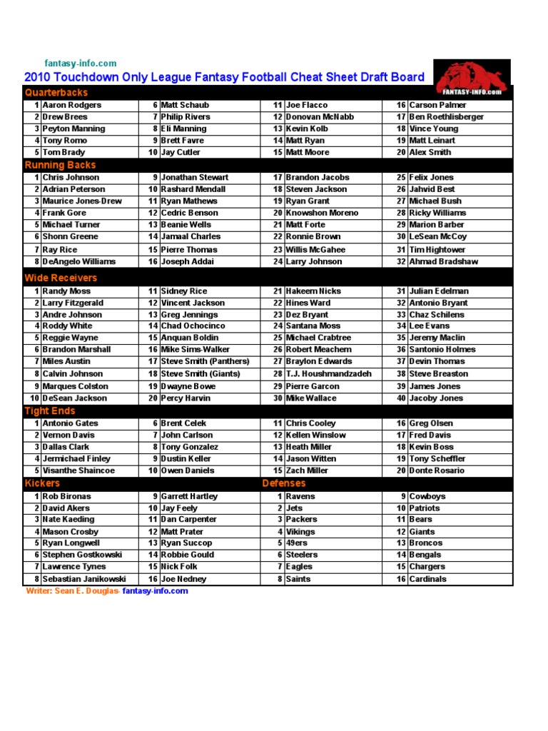 2010 Touchdown Only League Fantasy Football Cheat Sheet Draft Board
