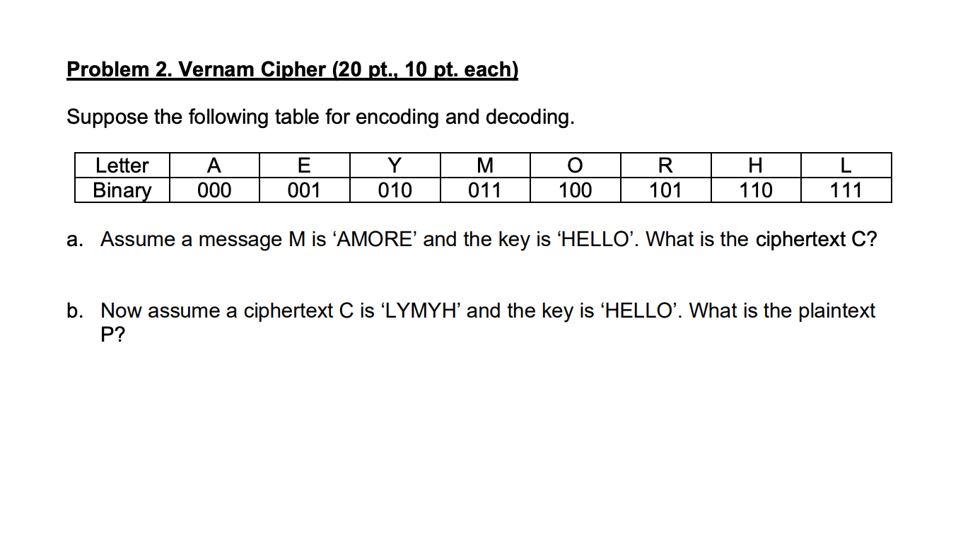 Solved Problem 2. Vernam Cipher (20 pt., 10 pt. each)